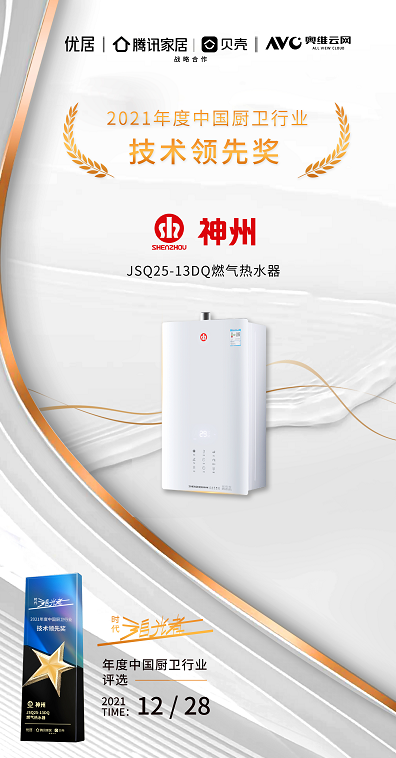 老板、康寶等眾多優秀廚衛品牌。經過多日激烈的投票角逐,神州JSQ25-13DQ燃氣熱水器憑借其過硬的產品實力與品牌影響力,榮獲“2021年度中國廚衛行業技術領先獎”殊榮,艷壓群雄,完成產品光環加冕。