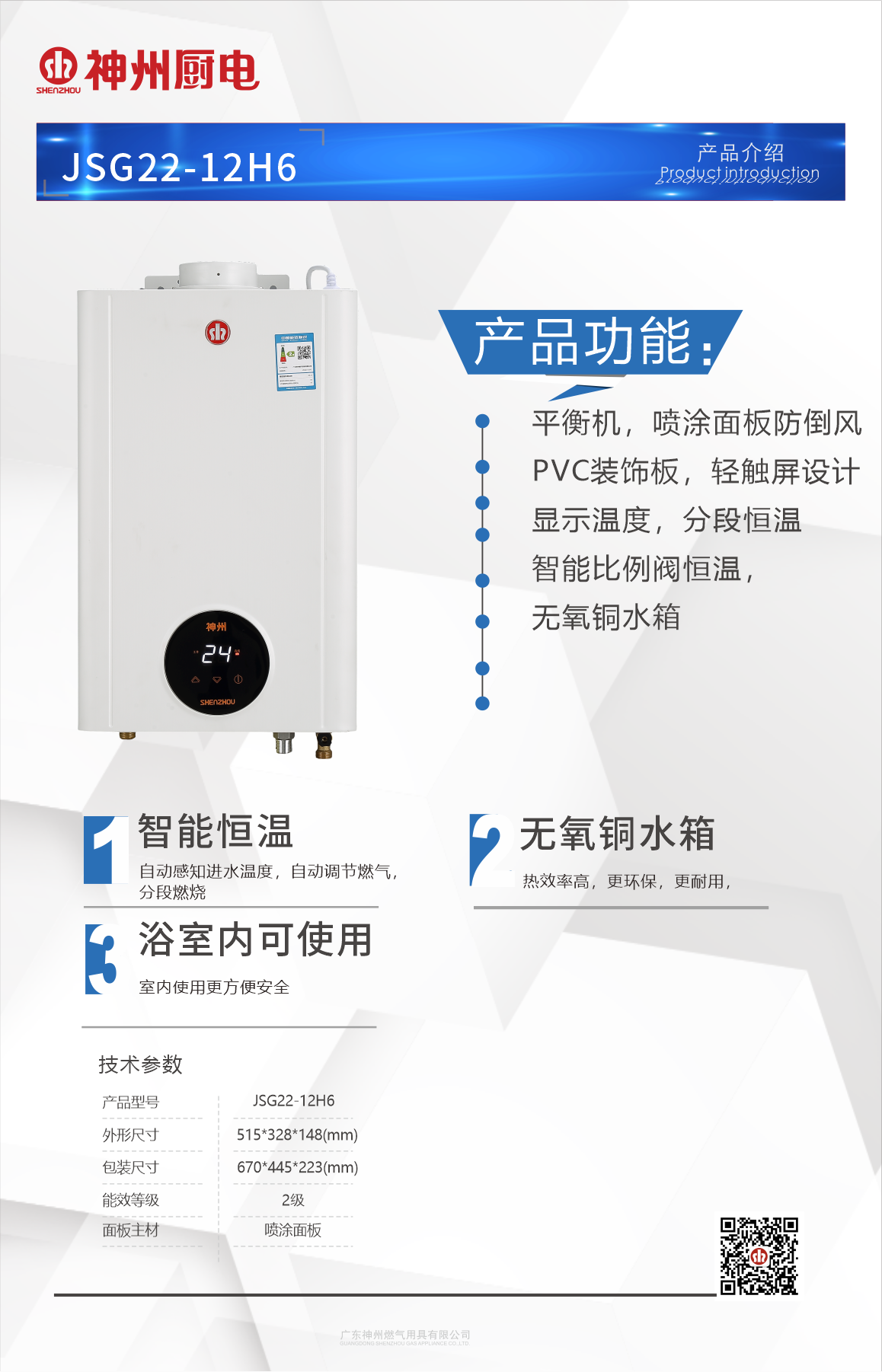 1、平衡機,噴涂面板防倒風 2、PVC裝飾板,輕觸屏設計 3、顯示溫度,分段恒溫 4、智能比例閥恒溫 5、無氧銅水箱" />